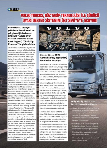Volvo Trucks, uzun yol şoförlerini desteklemek ve yol güvenliğini artırmak amacıyla “Sürücü Uyarı Destek Sistemi”ni (Driver Alert Support) “Göz-Takip Kamerası” ile güçlendiriyor!Volvo Trucks, uzun saatler boyunca yol-culuk yapan kamyon şoförlerinin dikkat ve konsantrasyonlarının korunması için yeni teknolojileri devreye alıyor. Volvo Trucks, mevcut sistemini daha da ge-liştirerek yorgunluk ya da dikkatsizlik belirtileri gösteren sürücüleri tespit edip uyarıyor. Volvo Trucks, sürücülerin yanında olmayı ve trafikteki herkesin güvenliğini desteklemeyi hedefliyor. Volvo Trucks’ın geliştirilmiş “Sürücü Uyarı Destek Sistemi”, iki kamera kul-lanıyor. Yan taraftaki ekranın üzerine yerleştirilen yeni “Göz-takip Kamerası”, sürücünün bakış yönü üzerinden dikkat dağınıklığı belirtilerini tanıyor, sürücüyü açılan mesaj penceresiyle ve sesli uyarı ile bilgilendiriyor. Mevcut sistemde bulunan, öne dönük kamera ise şeridin konumunu, kamyonun şerit içindeki yerini ve yol kenarına yakınlığını izliyor. Böylece uyku halindeki ya da dikkat dağınıklığı yaşayan bir sürücünün tipik davranış özellikleri tespit edilebiliyor.Konuyla ilgili açıklamada bulunan Volvo Trucks Trafik ve Ürün Güvenliği Direktö-rü Anna Wrige Berling; “Birkaç saatlik sürüşün ardından direksiyon başında uyanık ve odaklı kalmak zor olabilir. Geliştirilmiş Sürücü Uyarı Destek Sis-temimiz, yorgunluk ya da dikkatsizlik belirtileri gösteren bir sürücüyü algılama ve uyarmada çok daha iyi sonuçlar veri-yor. Amacımız, sürücüleri desteklemek ve onlar ile aynı yolu paylaşan kişileri korumaya yardımcı olmak. Sürekli ola-rak ek güvenlik sistemleri geliştiriyoruz ve devreye alıyoruz. Volvo Trucks’ta uzun vadeli vizyonumuz olan ‘Sıfır Kaza’ ve güvenlik yaptığımız her faaliyetin merkezinde yer alıyor.” dedi. AAM MARKARKVOLVO TRUCKS, GÖZ TAKİP TEKNOLOJİSİ İLE SÜRÜCÜ VOLVO TRUCKS, GÖZ TAKİP TEKNOLOJİSİ İLE SÜRÜCÜ UYARI DESTEK SİSTEMİNİ ÜST SEVİYEYE TAŞIYOR!UYARI DESTEK SİSTEMİNİ ÜST SEVİYEYE TAŞIYOR!Sistem, Güncel GSR2 (General Safety Regulation) Standardını KarşılıyorTemmuz 2026’da yürürlüğe girecek ikin-ci adım dahil olmak üzere, Avrupa Birliği (AB) içindeki tüm kamyonların “Gelişmiş Sürücü Dikkatsizlik Uyarısı” (ADDW) sis-temleriyle donatılması şart koşuluyor. Göz-takip Kamerası, 18 km/s üzerindeki hızlarda aktif hale geliyor. Geliştirilmiş Sürücü Uyarı Destek Sis-temi, AB’deki Volvo FH ve Volvo FM ile Volvo FL ve Volvo FE için standart olarak sunulacak. Sistem ayrıca Norveç, İsviçre ve Birleşik Krallık gibi bazı AB dışı pazarlarda da geçerli olacak. Diğer pazarlarda ise isteğe bağlı sipariş edile-bilecek. Sistem, Kasım 2025’te üretime geçiyor. AB dışındaki pazarlarda, bu-günkü ön kameralı Sürücü Uyarı Destek Sistemi sunulmaya devam edilecek.Güvenlik, Volvo Trucks için temel bir değer. Şirketin en çok satılan modelleri Volvo FH ve Volvo FM, 2024’te ağır kam-yonlar için ilk kez gerçekleştirilen Euro NCAP güvenlik testlerinde, en yüksek puan olan 5 yıldız ile ödüllendirildi. Vol-vo Trucks’ın 2024’teki ilk başarısının ar-dından; Euro NCAP’in 2025 yılında ger-çekleştirdiği, ağır ticari araçlara yönelik ikinci güvenlik testinde, hem Volvo FH Aero hem de Volvo FM, en yüksek puan olan 5 yıldızla yeniden ödüllendirildi.Geliştirilmiş Sürücü Uyarı Destek Sistemi özellikleri:• Sistem iki kameraya dayanıyor: Göz-ta-kip Kamerası, sürücünün nereye bak-tığını izleyerek dikkatsizlik belirtilerini algılıyor. Ön yönlü kamera ise şerit işaretleriyle sürücünün direksiyon hare-ketlerini karşılaştırıyor. • Dikkatsizlik ya da uykulu sürüş belirti-leri algılandığında, ekranda açılan me-sajla ve sesli uyarıyla bilgilendiriliyor. • Dikkatsiz sürüş devam ederse sesli uyarı seviyesi yükseliyor.• Sistem, kontağın açılmasıyla otomatik olarak devreye giriyor. 16www.kamyonum.com.tr