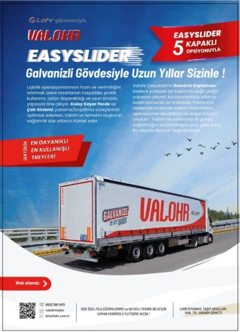 +90 264 654 59 50www.valohr.com.trWeb s tem z: SİZE ÖZEL FİLO ÇÖZÜMLERİMİZ ve DETAYLI TEKNİK BİLGİ İÇİNUZMAN EKİBİMİZLE İLETİŞİME GEÇİN !0533 391 1473LOHR İSTANBUL TAŞIT ARAÇLARI SAN. TİC. ANONİM ŞİRKETİvalohrtreyler nfo@lohr.com.trEASYSLIDER EASYSLIDER Lojistik operasyonlarınızın hızını ve verimliliğiniartırmak üzere tasarlanan Easyslider, pratikkullanımı, üstün dayanıklılığı ve uzun ömürlüyapısıyla öne çıkıyor. Kolay Kayar Perde veÇatı Sistemi, yükleme/boşaltma süreçlerinizioptimize ederken, Valohr'un temelini oluşturansağlamlık size yıllarca hizmet eder.Valohr Easyslider'ın Galvaniz Kaplamasısadece yüzeysel bir kaplama değil çeliğinyapısına işleyen, korozyona karşı yıllarcasüren benzersiz bir kalkandır. Paslanmanedeniyle oluşacak bakım masraflarını,operasyonel aksaklıkları ve değer kaybınıunutun ! Valohr ile yatırımınız ilk günküsağlamlığını ve parlaklığını uzun yıllar korur.Bu sayede ikinci el değerini korur.Galvan zl Gövdes yle Uzun Yıllar S z nle !güvencesiyle,0533 391 1473EASYSLIDER 55KAPAKLI OPSİYONUYLA
