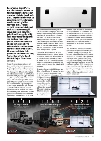 Deep Trailer Spare Parts, son olarak treyler yemek ve takım dolaplarında yaşanan sorunları dikkate alarak yola çıktı. Tır şoförlerinin öneri ve görüşlerinden yararlanarak, sac dolaplarda görülen toz ve su alma, yüksek sıcaklık ve soğukta ürünleri muhafaza edememe gibi sorunlara kalıcı çözümler geliştiren firma, geliştirdiği yeni nesil treyler dolaplarını seri üretime hazır hale getirdi. Böylelikle sektörde ilk kez yemek dolabı ve takım dolabı ayrı birer ünite olarak sunulmaya başlandı. Firmanın sektörde fark yaratacak yeni ürününü Deep Trailer Spare Parts Genel Müdürü Buğra Güven’den dinledik.İlk olarak yemek dolabı ve takım dola-bının ayrı bir ünite olarak sunulmasının şoförlere getireceği avantajları anlatarak sözlerine başlayan Güven şunları söyledi; “İlk olarak yemek dolabı ile takım dolabı-nın birbirinden ayrılması, iki farklı kullanı-mın fiziksel ihtiyaçlarına uygun malzeme ve yalıtım çözümü geliştirmeyi mümkün kılıyor. Takım dolapları genellikle metal (sac) olduğu için yüksek sıcaklıkta ısınır-ken düşük sıcaklıkta soğuyor, yoğuşma ve pas yapıyor. Bu nedenle aynı dolapta yiyecek bulundurmak hijyen, koku ve güvenlik açısından sakıncalı hale geliyor. Yeni sistemle yemek dolabı artık yalıtımlı, gıda muhafazasına uygun malzemeden üretilebiliyor. Bu sayede toz, su ve sıcak-lık farklarından etkilenmeden yiyecek saklama mümkün hale geliyor. Sürücüler uzun yol koşullarında gıdalarını güvenle koruyabiliyor. Aynı zamanda ayrı ünite yaklaşımı, “bir dolap her işe yarasın” mantığını ortadan kaldırıyor. Bu sayede takım dolabı ağır ve yağlı ekipmanlar için dayanıklı, yemek dolabı ise temiz, izolas-yonlu bir alan olarak tasarlanıyor. Bu da araçların uzun ömürlü, düzenli ve sürücü dostu hale gelmesini sağlıyor.”Tüm bunlar sebebiyle yemek ve takım dolaplarının ayrılmasının, sürücü sağlığı ve ekipman dayanıklılığı açısından kritik bir yenilik olduğunu vurgulayan Güven, bu adımın, uzun yol taşımacılığında hem hijyen hem de operasyonel verimlilik açı-sından sektörde standartları yükselttiğini ifade etti.Güven tüm bunların büyük bir önem taşı-dığını ve kendilerinin de yaşanan bu sorun ile ilgili bir yılı aşkın bir süre boyunca Ar-Ge faaliyetlerinde bulunduğunu belirt-ti. Ürün geliştirme sürecinde tır şoförlerinin de görüş ve önerilerinden faydalandıklarını aktaran Güven, nihayetinde yemek dolabı ile takım dolabı-nı birbirinden ayırarak treyler dolabı alanında bir yeniliğe daha imza atmanın gu-rurunu yaşadıklarını ifade etti. Güven sözlerine şöyle devam etti; “Biz sadece bir dolap üretmedik, tır şoförlerinin yol arkadaşı olacak yeni bir standart geliştir-dik. Şoförlerimizin uzun yolculuklarında daha konforlu yemek molaları geçirebil-meleri için, insan ve gıda dostu yeni nesil yemek dolabımızın geliştirme sürecini tamamladık ve seri üretime hazır hale getirdik.” Yeni nesil yemek dolaplarının özellikle-rini paylaşan güven şu ifadeleri kullandı; “Yeni nesil yemek dolabımızın sac dış katmanı, sağlamlık ve dayanıklılığı garan-ti ederken; ısı yalıtımlı iç yapısı sayesinde sıcak veya soğuk hava koşulları fark et-meksizin, dolap içindeki ürünleri stabil sıcaklıkta ve ideal koşullarda koruyor. Ay-rıca korozyona karşı %100 dayanıklı, gıda dostu plastik iç yüzeyi ile tır şoförlerine premium bir mola deneyimi sunuyoruz. Yeni nesil yemek dolabımızın toz, su hat-ta hava dahi almayacağını garanti ederek sektöre sunuyoruz.”31www.kamyonum.com.tr