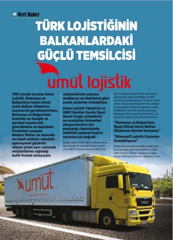 1992 yılında kurulan Umut Lojistik, Romanya ve Bulgaristan başta olmak üzere Balkan ülkelerine taşımacılık gerçekleştirirken, Romanya ve Bulgaristan özelinde ise komple ve parsiyel taşımacılık, gümrükleme ve depolama hizmetleri sunuyor. Modern filoları ve alanında tecrübeli ekibiyle sahadaki operasyonel güçlerini artıran şirket aynı zamanda müşterilerine sağladığı butik hizmet anlayışıyla müşterilerinin çalışma modlarına ve isteklerine göre esnek çözümler üretebiliyor.Umut Lojistik Yöneticisi ve UND Yönetim Kurulu Üyesi Murat Cengiz şirketlerini ve sundukları hizmetleri okuyucularımız için paylaştığı röportajında, sektörde yaşanan başlıca sorunlara da değindi.Cengiz ailesi olarak 1960’lı yıllarda yolcu taşımacılığı ile başlayan ticari hayatla-rının 1980’li yıllarda babaları İshak Cen-giz‘in kamyonculuğa merak sarmasıyla yük taşımacılığına evrildiğini ve 1992 yılında kurumsallaşmanın ilk adımı olarak Umut Uluslararası Nakliyat’ın kurulduğu-nu söyleyerek sözlerine başlayan Cengiz, kendilerinin ise 1992 yılında çalışmaya başladığı Umut Lojistik şirketinde 2. Ku-şak olarak işlerini yönettiklerini belirtti.“Romanya ve Bulgaristan Başta Olmak Üzere Balkan Ülkelerine Hizmet Veriyoruz”“Alternatif Lojistik Çözümler Üretebiliyoruz”Filolarında tercihlerini MAN ve DAF mar-ka araçlardan yana kullandıklarını ifade eden Cengiz; “Günün koşullarına uygun olarak filomuzu mümkün olduğunca yeni TÜRK LOJİSTİĞİNİN BALKANLARDAKİ GÜÇLÜ TEMSİLCİSİÖzel Haber32www.kamyonum.com.tr