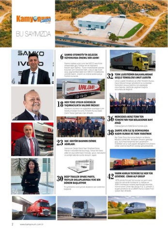 BU SAYIMIZDA26Umut Lojistik Yöneticisi ve UND Yönetim Kurulu Üyesi Murat Cengiz şirketlerini ve sundukları hizmetleri okuyucularımız için paylaştığı röportajında, sektörde yaşanan başlıca sorunlara da değindi.32TÜRK LOJİSTİĞİNİN BALKANLARDAKİ GÜÇLÜ TEMSİLCİSİ UMUT LOJİSTİK32Samko kalitesi artık Izmir’de:IVECO tercihinin arkasındaki güç Türkiye’nin en kapsamlı tesisini açtı! Samko, 15 bin metrekarelik alanda bulunan yeni tesisinde hafif, orta ve ağır ticari araç segmentlerindeki tüm IVECO modellerine yönelik bakım, onarım ve orijinal yedek parça hizmeti sunacak.3438Alp Özler Grup Kurumsal İletişim ve Marka Müdürü Zarife Atik ile kadın olmanın getirdiği güç, kurumsal iletişimde fark yaratmanın incelikleri ve iş-özel yaşam dengesini korumanın yolları üzerine keyifli bir söyleşi gerçekleştirdik.ZARİFE ATİK İLE İŞ DÜNYASINDA KADIN OLMAK VE FARK YARATMAKTır şoförlerine özel yemek dolabının seri üretimine başlandı1979 yılında Kocaeli’de kurulan ve yarım asra yakın bir zamandır konteyner iç nakliye ve ADR’li konteyner isotank taşımacılığı alanında hizmet veren Cihan Alp Group A.Ş.’yi, şirketin 3. kuşak yöneticisi ve LOJİDER Kurucu Üyesi Fırat Çakan’dan dinledik. 42YARIM ASIRLIK TECRÜBE İLE HER YÜK GÜVENDE: CİHAN ALP GROUP418Markanın ürünlerini ve sağladıkları avantajları Lohr İstanbul İcradan Sorumlu Yönetim Kurulu Üyesi Cemil Tanar Çakmakcı’dan dinledik.HER YÜKE UYGUN GÜVENİLİR TAŞIMACILIKTA VALOHR İMZASI!Kamyonum Dergisi Genel Yayın Yönetmeni Nuray Pekcan’ın da aralarında bulunduğu, Türkiye’den davet edilen bir grup sektör basın mensubu gücün, teknolojinin ve yeniliğin kalbinde özel bir deneyim yaşadı.23DAF, SEKTÖR BASININI EVİNDE AĞIRLADI:30DEEP TRAILER SPARE PARTS, TREYLER DOLAPLARINDA YENİ BİR DÖNEM BAŞLATIYOR36MERCEDES-BENZ TÜRK’TEN TÜRKİYE’NİN YEDİ BÖLGESİNDE BAYİ ATAĞIOdabaşı Şanlıurfa Yetkili Servisi hizmete açıldı.6SAMKO OTOMOTİV’İN GELECEK VİZYONUNDA ÖNEMLİ BİR ADIM!2www.kamyonum.com.tr