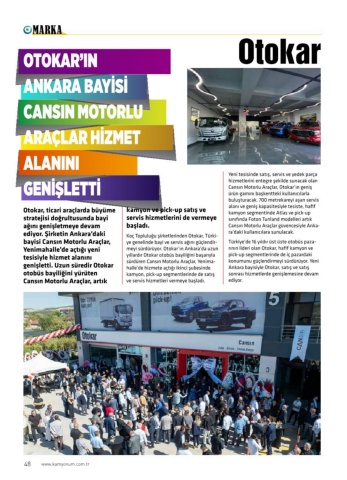 Otokar, ticari araçlarda büyüme stratejisi doğrultusunda bayi ağını genişletmeye devam ediyor. Şirketin Ankara’daki bayisi Cansın Motorlu Araçlar, Yenimahalle’de açtığı yeni tesisiyle hizmet alanını genişletti. Uzun süredir Otokar otobüs bayiliğini yürüten Cansın Motorlu Araçlar, artık AAM MARKARKOTOKAR’IN ANKARA BAYİSİ CANSIN MOTORLU ARAÇLAR HİZMET ALANINI GENİŞLETTİkamyon ve pick-up satış ve servis hizmetlerini de vermeye başladı. Koç Topluluğu şirketlerinden Otokar, Türki-ye genelinde bayi ve servis ağını güçlendir-meyi sürdürüyor. Otokar’ın Ankara’da uzun yıllardır Otokar otobüs bayiliğini başarıyla sürdüren Cansın Motorlu Araçlar, Yenima-halle’de hizmete açtığı ikinci şubesinde kamyon, pick-up segmentlerinde de satış ve servis hizmetleri vermeye başladı.Yeni tesisinde satış, servis ve yedek parça hizmetlerini entegre şekilde sunacak olan Cansın Motorlu Araçlar, Otokar’ın geniş ürün gamını başkentteki kullanıcılarla buluşturacak. 700 metrekareyi aşan servis alanı ve geniş kapasitesiyle tesiste, hafif kamyon segmentinde Atlas ve pick-up sınıfında Foton Tunland modelleri artık Cansın Motorlu Araçlar güvencesiyle Anka-ra’daki kullanıcılara sunulacak. Türkiye’de 16 yıldır üst üste otobüs paza-rının lideri olan Otokar, hafif kamyon ve pick-up segmentlerinde de iç pazardaki konumunu güçlendirmeyi sürdürüyor. Yeni Ankara bayisiyle Otokar, satış ve satış sonrası hizmetlerde genişlemesine devam ediyor.48www.kamyonum.com.tr