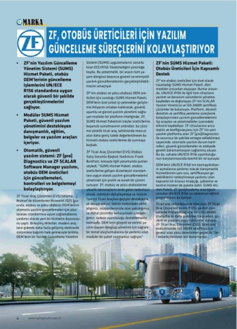 AAM MARKARK• ZF’nin Yazılım Güncelleme Yönetim Sistemi (SUMS) Hizmet Paketi, otobüs OEM’lerinin güncelleme işlemlerini UN/ECE R156 standardına uygun olarak güvenli bir şekilde gerçekleştirmelerini sağlıyor.• Modüler SUMS Hizmet Paketi, güvenli yazılım yönetimini destekleyen danışmanlık, eğitim, belgeler ve yazılım araçları içeriyor.• Otomatik, güvenli yazılım sistemi: ZF [pro]Diagnostics ve ZF SCALAR Software Manager yazılımı, otobüs OEM üreticileri için güncellemeleri, kontrolleri ve belgelemeyi kolaylaştırıyor.ZF Ticari Araç Çözümleri (CVS) bölümü, Brüksel’de düzenlenen Busworld 2025 fua-rında, otobüs ve yolcu otobüsü OEM’lerinin otomotiv yazılım güncellemeleri için ulus-lararası standartlara uyum sağlamalarına yardımcı olacak yeni bir hizmetin duyurusu-nu yaptı. Birleşmiş Milletler, modern araç-ların giderek daha fazla gelişmiş elektronik sistemlere bağımlı hale gelmesiyle birlikte, OEM’lerin bir Yazılım Güncelleme Yönetim Sistemi (SUMS) uygulamalarını zorunlu kılan ECE/R156 Yönetmeliğini yürürlüğe koydu. Bu yönetmelik, bir aracın tüm ya-şam döngüsü boyunca güvenli ve emniyetli yazılım güncellemelerinin gerçekleştirilebil-mesini amaçlıyor. ZF’nin otobüs ve yolcu otobüsü OEM üre-ticileri için sunduğu SUMS Hizmet Paketi, OEM’lerin özel şirket içi yetenekler geliştir-me ihtiyacını ortadan kaldırarak, güvenli, uyumlu ve güncel yazılım yönetimi sağla-yan modüler bir platform niteliğinde. ZF, SUMS Hizmet Paketinin treyler üreticilerine başarıyla sunulmasının ardından, bu çözü-me yönelik ticari araç sektöründe mevcut olan daha geniş talebi değerlendirerek bu hizmeti otobüs üreticilerine de sunmaya başladı. ZF Ticari Araç Çözümleri (CVS) Otobüs Satış Sorumlu Başkan Yardımcısı Frank Burkhart, konuyla ilgili yorumunda şunları söyledi; “SUMS Hizmet Paketi, otobüs üreticilerine gelişen düzenleyici standart-lara uygun olarak yazılım güncellemelerini yönetmek için pratik ve esnek bir çözüm sunuyor. ZF, otobüs ve yolcu otobüslerine yönelik teknolojilerin önde gelen tedarikçisi olarak, sektörün dijitalleşmeye ve Yazılım Tanımlı Ticari Araçlara geçişini destekleme-ye devam ediyor. Sektör hakkındaki derin bilgimiz, müşterilerimizle olan yakınlığımız ve dijital çözümler konusundaki uzmanlı-ğımız, sadece uyumluluğu desteklemekle kalmayıp, OEM’lerin güvenli ve verimli ya-zılım yaşam döngüsü yönetimi için sağlam bir temel oluşturmalarına da yardımcı olan modüler bir paket sunmamızı sağlıyor.” ZF’nin SUMS Hizmet Paketi: Otobüs Üreticileri İçin Kapsamlı Destek ZF’nin otobüs üreticileri için özel olarak tasarladığı SUMS Hizmet Paketi, dört modüler unsurdan oluşuyor. Bunlar arasın-da, UN/ECE R156 ile ilgili tüm cihazların yazılım ve donanım sürümlerini yöneten, kaydeden ve doğrulayan ZF’nin SCALAR Yazılım Yöneticisi ve ISO 24089 sertifikalı çözümler de bulunuyor. Platform, düzenli denetim ve sertifika yenileme süreçlerini kolaylaştırırken yazılım güncellemelerinin tip onayları ve yönetmelikler üzerindeki etkisini kaydediyor. ZF cihazlarının arıza teşhis ve konfigürasyonu için ZF’nin yeni yazılım platformu olan ZF [pro]Diagnostics ile sorunsuz bir şekilde entegre edilebilmesi sayesinde, otomatik yazılım durum kont-rolleri, güvenli güncellemeler ve atölyede gerekli dokümantasyon sağlanmış oluyor. Bu da, sahada UN/ECE R156 uyumluluğu-nun karşılanmasında önemli bir rol oynuyor.OEM’lerin UN/ECE R156’nın karmaşıklıkları-nı aşmalarına yardımcı olacak danışmanlık hizmetlerinin yanı sıra, sertifikasyon ge-rekliliklerini netleştirmeye yardımcı olan kapsamlı bir kılavuz kitapçığı, şablonlar ve kontrol listeleri de pakete dahil. SUMS Hiz-met Paketi, ZF [pro]Academy aracılığıyla sunulan UN/ECE R156’ya odaklanan eğitim programlarını da içeriyor.Ticari araç teknolojisinde lider olan ZF Ticari Araç Çözümleri birimi (CVS), yazılım gün-celleme mühendisliği için titiz ISO 24089 stadartlarını daha şimdiden karşılarken, gü-venli ve yasalara uygun çözümler sunuyor. ZF Ticari Araç Çözümleri (CVS), ticari araç endüstrisinde ISO 24089 sertifikası için gerekli olan zorlu denetimleri geçen ilk Tier-1 tedarikçilerinden biri konumunda.ZF, OTOBÜS ÜRETİCİLERİ İÇİN YAZILIM GÜNCELLEME SÜREÇLERİNİ KOLAYLAŞTIRIYOR4www.kamyonum.com.tr